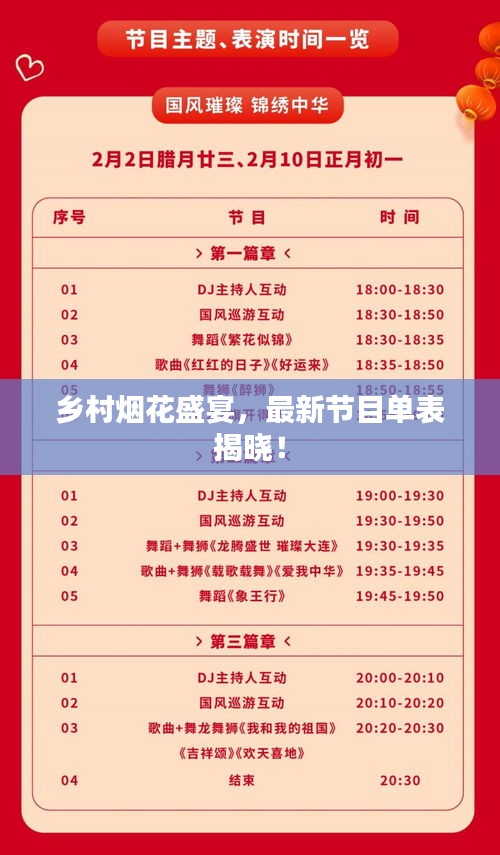 這場鄉(xiāng)村煙花晚會將為大家?guī)硪粓鲭y忘的視覺盛宴,讓我們共同期待這場盛會的到來,感受節(jié)日的喜慶和歡樂,也希望大家在觀賞煙花的過程中,能夠感受到鄉(xiāng)村文化的魅力和傳統(tǒng)文化的獨特韻味,最新鄉(xiāng)村煙花晚會節(jié)目單表如上所述,讓我們一起期待這場精彩紛呈的煙花晚會吧!